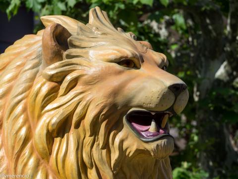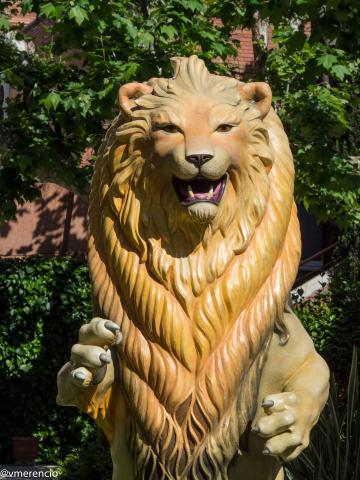 El lleó està dempeus, recolza el pes del seu cos sobre les seves potes del darrere, i no pas en posició desafiant com la majoria de lleons. El cos del lleó no és sencer, aquest queda tallat just a l'inici de les potes de la part posterior, on es veuen les cames del portador.