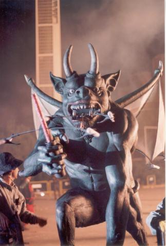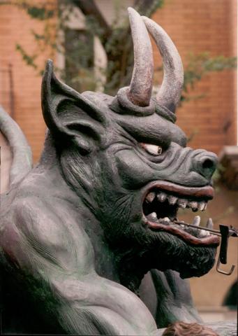 Es tracta d'una gàrgola alada i d'una figura antropomòrfica, la qual recorda a diferents animals units fent una bèstia infernal, dotada de dues banyes, un nas de porc, amb ales de ratpenat, dents ferotges, cos d'home, urpes a mans i peus, i, a més, una cua de reptiliana que recorda a un llangardaix. La figura és de cos sencer i recolza les cames i la mà esquerra sobre una pedra. Al coll hi duu penjada una medalla amb l'escut de Sant Martí. Sistema de Portatge i mobilitat